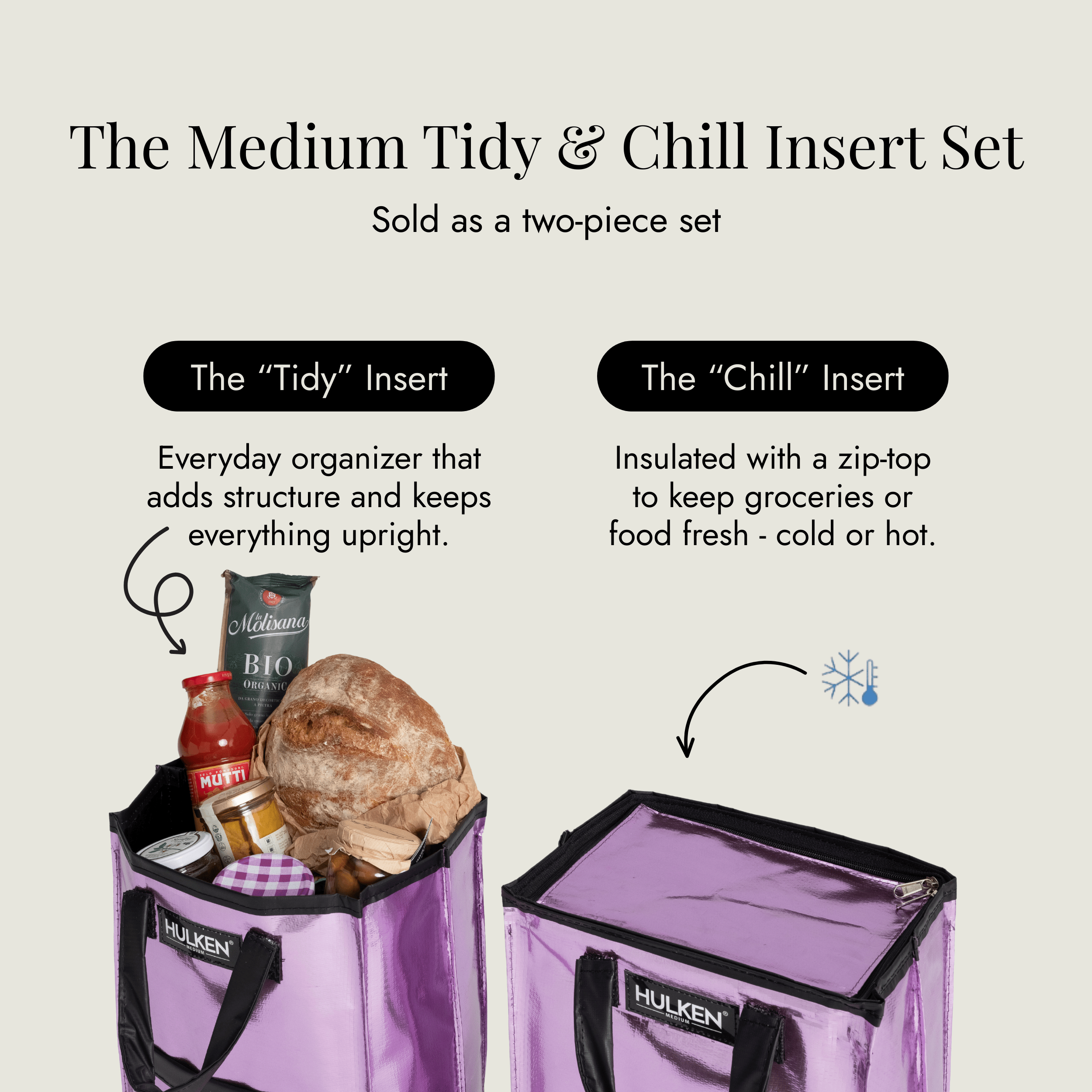 Das Tidy & Chill Insert Set ist ein zweiteiliges Organizer-Einsatzsystem für Tragetaschen, das Ihrer Hulken-Rolltasche Struktur, Ordnung und Isolierung verleiht. Ob Lebensmittel, Wäsche oder Mahlzeiten – dieses leichte Set dient gleichzeitig als Taschen-Organizer-Einsatz und wiederverwendbarer, isolierter Tragetaschen-Einsatz, damit alles aufrecht, getrennt und leicht zu transportieren ist.