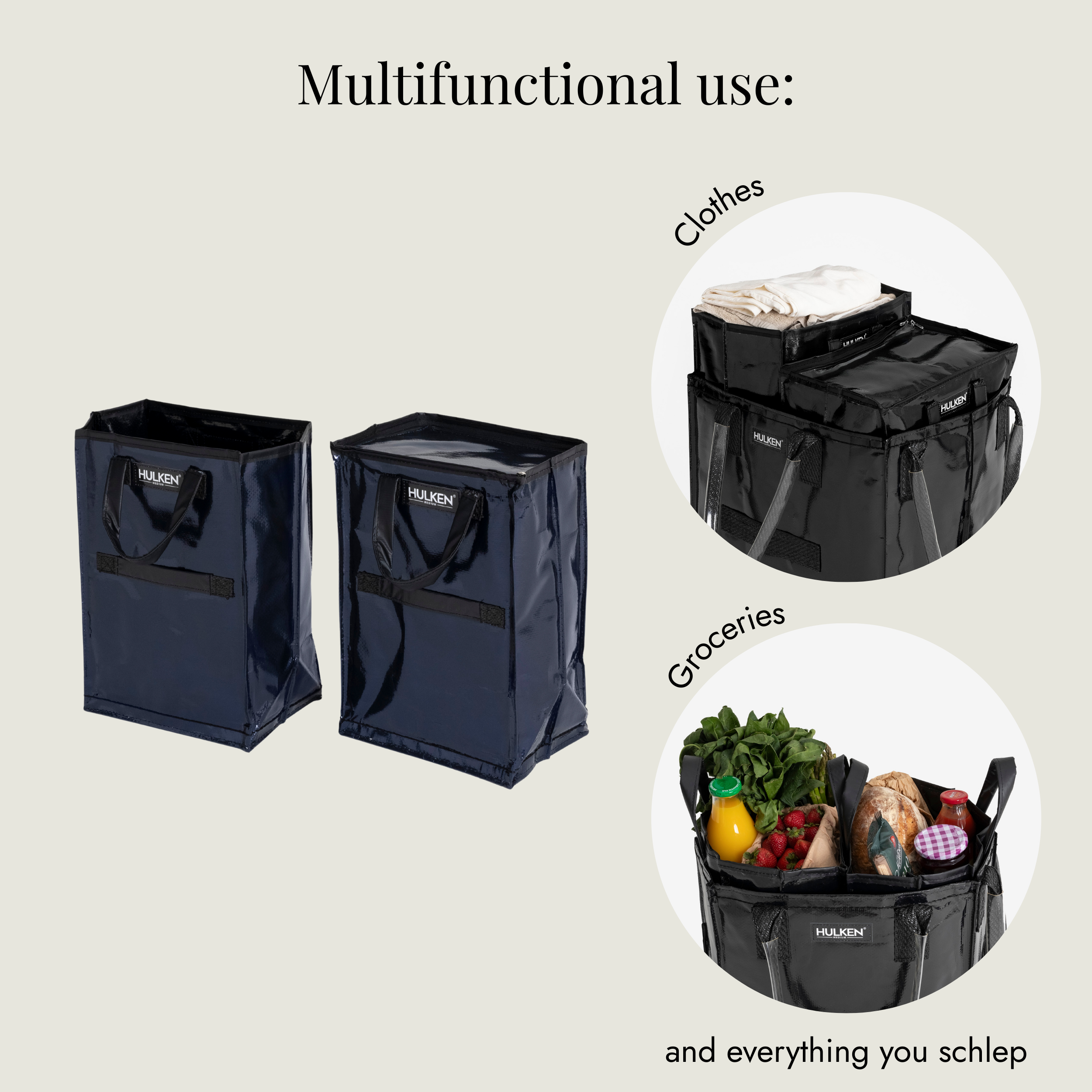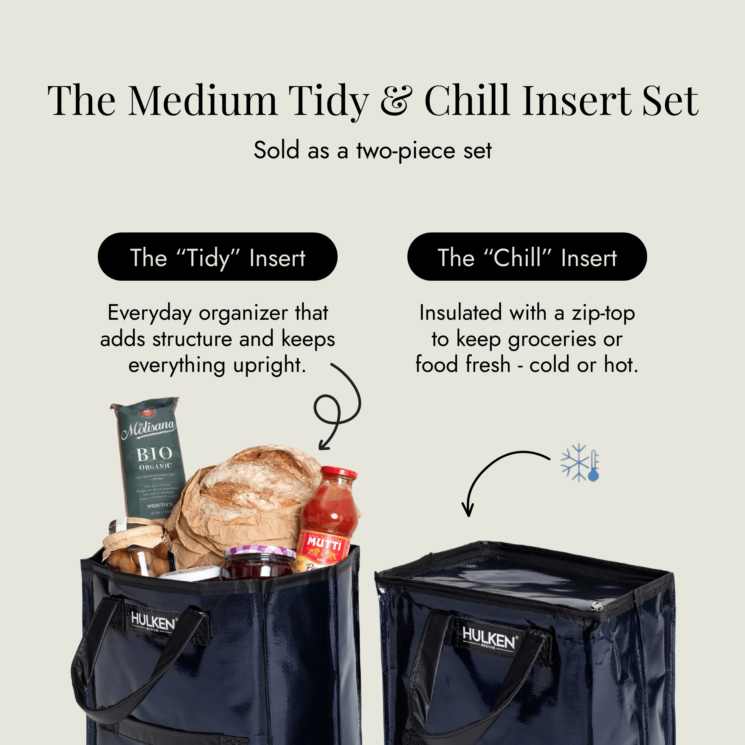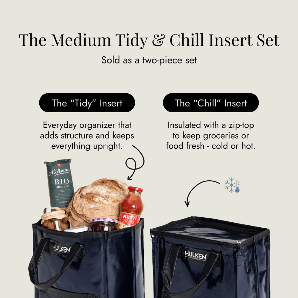 Das Tidy & Chill Insert Set ist ein zweiteiliges Organizer-Einsatzsystem für Tragetaschen, das Ihrer Hulken-Rolltasche Struktur, Ordnung und Isolierung verleiht. Ob Lebensmittel, Wäsche oder Mahlzeiten – dieses leichte Set dient gleichzeitig als Taschen-Organizer-Einsatz und wiederverwendbarer, isolierter Tragetaschen-Einsatz, damit alles aufrecht, getrennt und leicht zu transportieren ist.