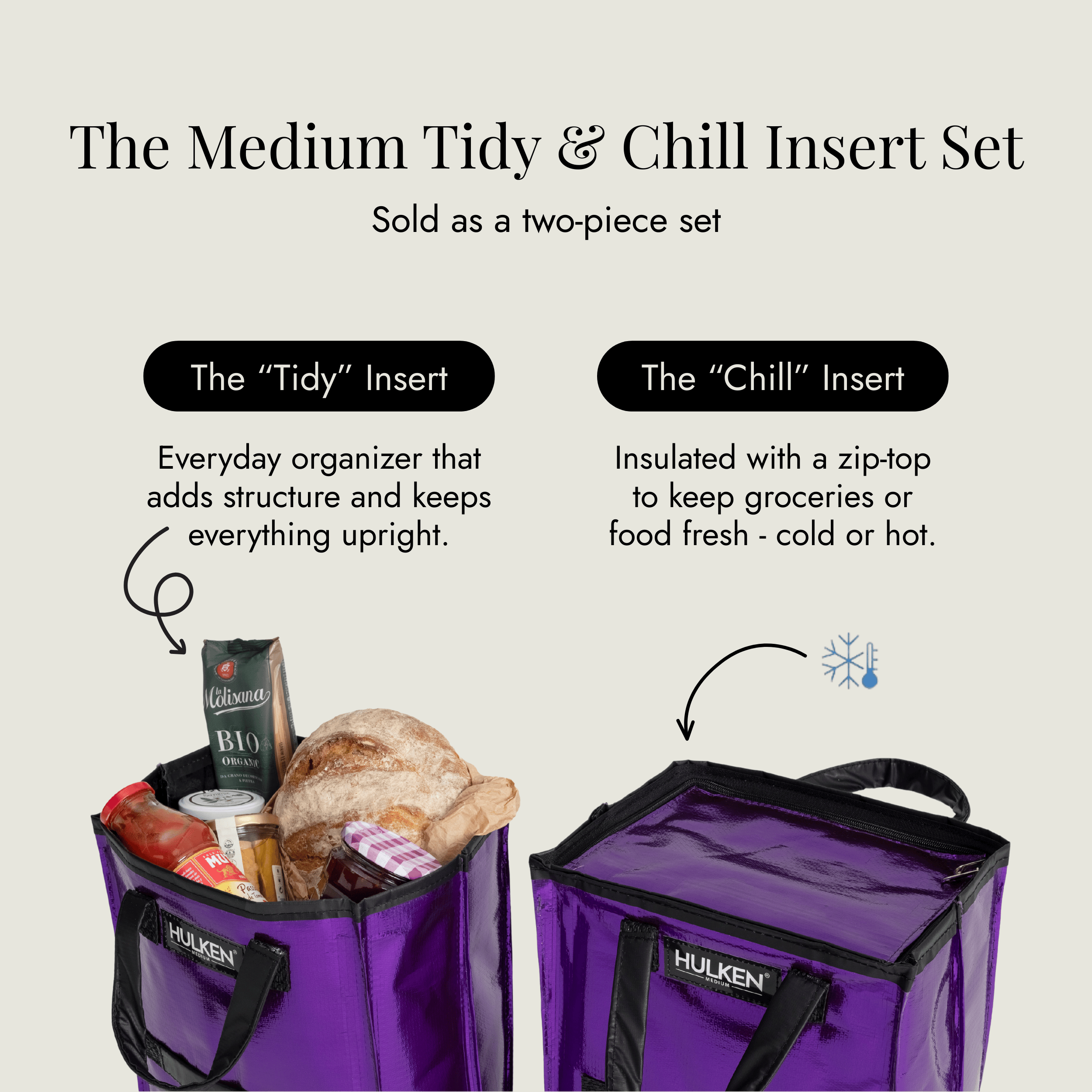 *Bitte beachten Sie:Das Tidy & Chill Insert Set ist separat von der Hulken Rolltasche erhältlich. Es handelt sich um ein Set mit nur zwei Einsätzen (1 Tidy Insert + 1 Chill Insert). Diese Einsätze passen in Ihre Hulken Rolltasche und bieten als Organizer-System zusätzliche Struktur und Isolierung. Sie sind nicht im Lieferumfang enthalten und keine Hulken-Tasche.