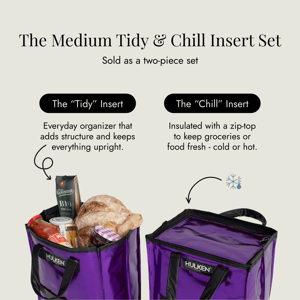 Das Tidy & Chill Insert Set ist ein zweiteiliges Organizer-Einsatzsystem für Tragetaschen, das Ihrer Hulken-Rolltasche Struktur, Ordnung und Isolierung verleiht. Ob Lebensmittel, Wäsche oder Mahlzeiten – dieses leichte Set dient gleichzeitig als Taschen-Organizer-Einsatz und wiederverwendbarer, isolierter Tragetaschen-Einsatz, damit alles aufrecht, getrennt und leicht zu transportieren ist.